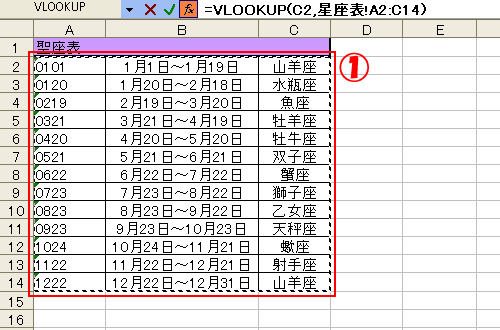 A列の星座開始日付に関しましては、参照する場合に必要になりまして、セルの書式設定で文字列にて指定しています。